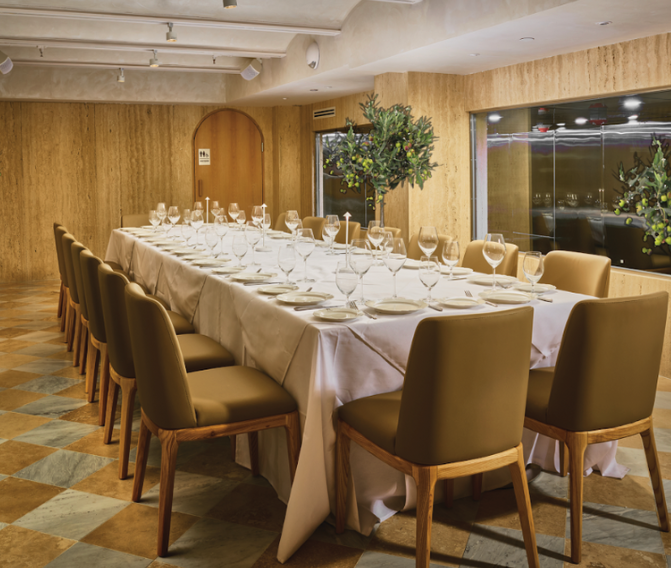 Highlights: intimate salon on the mezzanine level, warm textures and soft lighting, perfect for tasting menus and executive meetings.